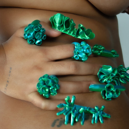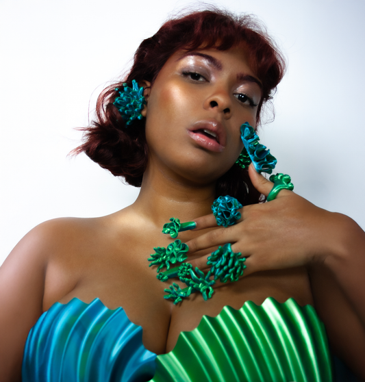 Introducing our inaugural collection, Bathe In The Waters, where the power of nature meets the artistry of design couture. This collection brings together the boldness of 3D-printed accessories and the intricate elegance of haute couture, creating a striking fusion of texture, color, and form that channels not only the depths of the ocean but also the natural contours, curves, and vitality of the human body. Bathe In The Waters isn’t just an accessories collection—it’s an immersive experience celebrating the bold and the beautiful, defining the modern goddess.