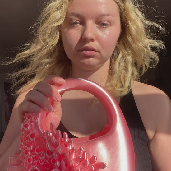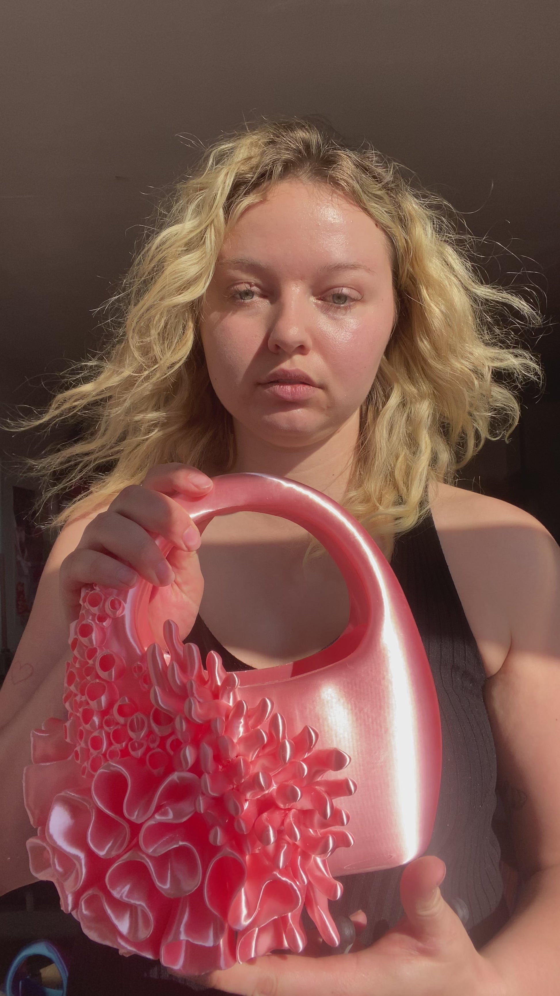 Don't resist the ethereal allure of the Siren Bag in Satin Baby Pink–a captivating blend of artistry and innovation. Inspired by the delicate forms of coral reefs, this 3D-printed design reimagines their beauty in a soft, shimmering pink hue. With its organic coral-like texture and sculptural silhouette, the Siren Bag embodies the raw enchantment of the ocean, offering a bold statement piece for the modern goddess.