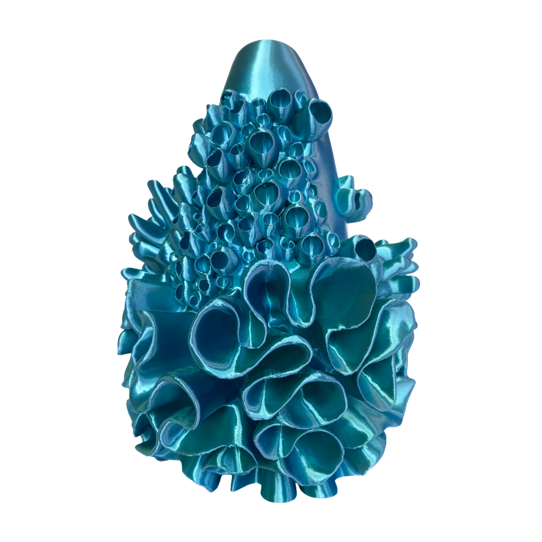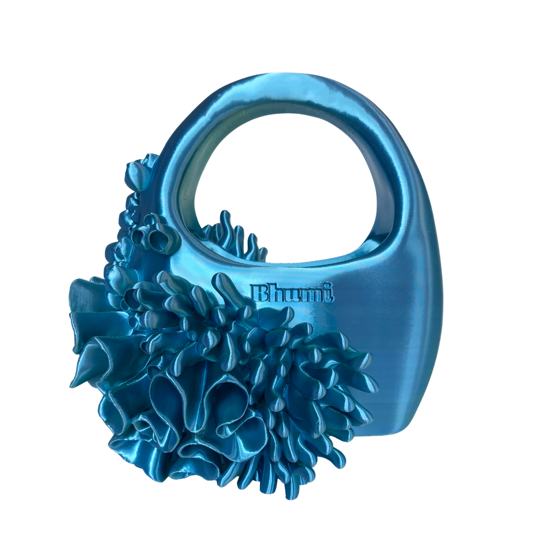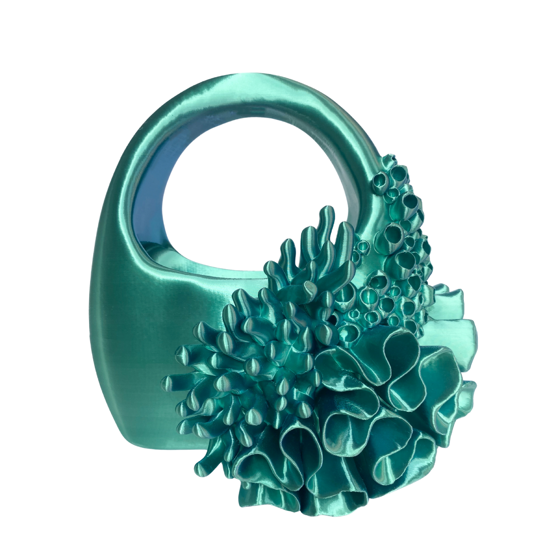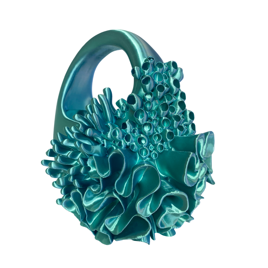 Don't resist the ethereal allure of the Siren Bag in Satin Multitone Blue/Green–a captivating blend of artistry and innovation. Inspired by the delicate forms of coral reefs, this 3D-printed design reimagines their beauty with a mesmerizing gradient that shifts between vibrant blue and green tones. With its organic coral-like texture and sculptural silhouette, the Siren Bag embodies the raw enchantment of the ocean, offering a bold statement piece for the modern goddess.
